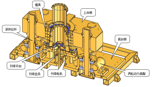 功能描述:將填充好襯墊載體的殼體放入升降平臺(tái)上,啟動(dòng)設(shè)備,升降電機(jī)動(dòng)作,帶動(dòng)升降齒條將殼體下降至縮徑位置。然后兩側(cè)電機(jī)同步啟動(dòng)動(dòng)力帶動(dòng)齒輪箱轉(zhuǎn)動(dòng),兩端滾珠絲桿帶動(dòng)上臺(tái)板下移,進(jìn)行縮徑加工,而后,兩側(cè)伺服電機(jī)反轉(zhuǎn),上臺(tái)板上移復(fù)位,加工好的產(chǎn)品通過(guò)步進(jìn)電機(jī)帶動(dòng)的升降齒條端部的升降平臺(tái)拖出模具,拿取工件。